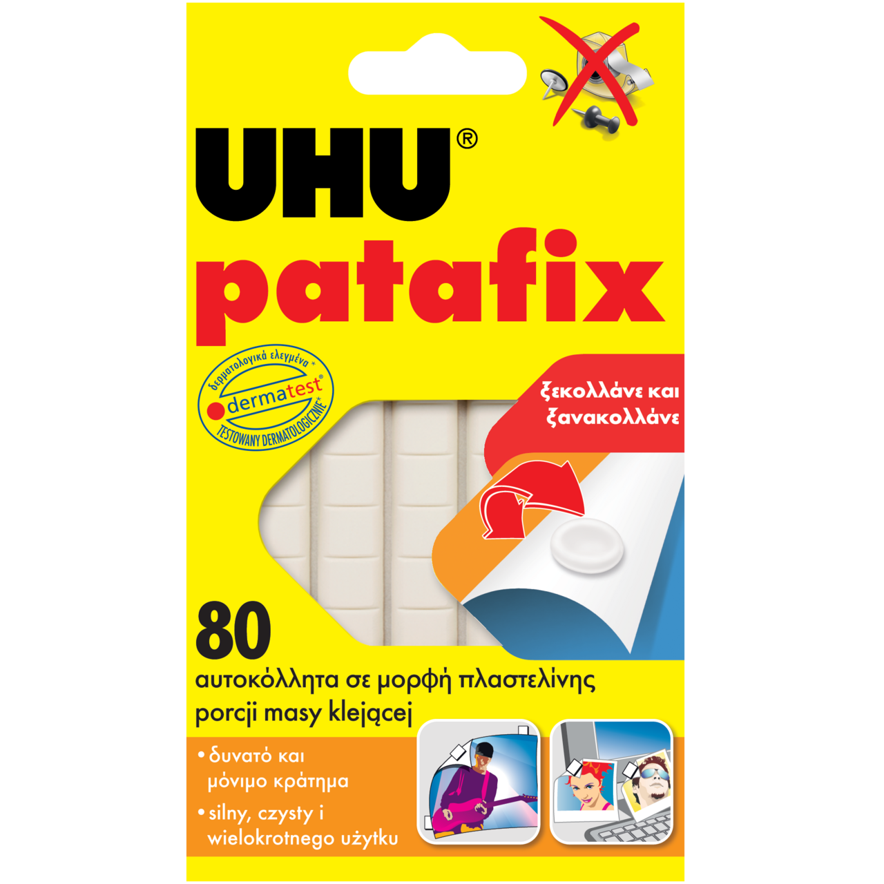 Τα UHU patafix είναι αφαιρούμενα, επαναχρησιμοποιούμενα αυτοκόλλητα σε μορφή πλαστελίνης και καθαρή στερέωση μικρών αντικειμένων, όπως φωτογραφίες, καρτ-ποστάλ, ζωγραφιές, αφίσες σε διάφορες επιφάνειες όπως τοίχους, πόρτες ή έπιπλα. 1000 χρήσεις στο σπίτι, το σχολείο και το γραφείο! Αφαιρούμενη και μόνιμη προσκόλληση μικρών αντικειμένων σε ξύλο, τσιμέντο, γυαλί, μέταλλο, πλαστικό και πορσελάνη. Κατάλληλα για τοποθέτηση αφισών, διακοσμήσεων, μικρών ηλεκτρονικών συσκευών, καλωδίων και πολλά άλλα. Ακατάλληλο για ευαίσθητα υλικά ή επιφάνειες. Μην χρησιμοποιείτε σε πρόσφατα βαμμένες περιοχές και ταπετσαρίες. ∆οκιμάστε πρώτα ένα μικρό δείγμα. Οι περιοχές προς κόλληση πρέπει να είναι καθαρές, στεγνές και να μην έχουν σκόνη ή λιπαρότητα. ∆ερματολογικά ελεγμένα. * *Τα UHU patafix πέτυχαν το αποτέλεσμα "ΠΟΛΥ ΚΑΛΑ" στις δερματολογικές δοκιμές που διεξάχθηκαν από το ανεξάρτητο ινστιτούτο δερματολογικών ελέγχων dermatest®. Συσκευασία 80τεμάχια.