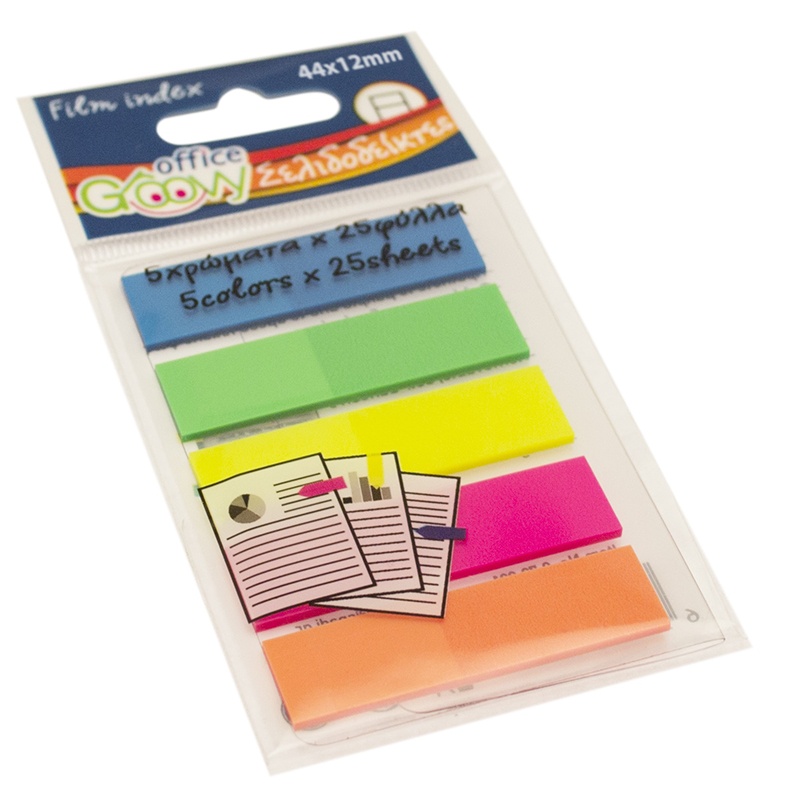 Σελιδοδείκτες πλαστικοί επανατοποθετούμενοι. Κολλούν σε όλες τις επιφάνειες και αφαιρούνται εύκολα χωρίς να αφήνουν κόλλα. Δε σκίζονται και μπορείτε να γράψετε εύκολα επάνω τους. 5 μπλοκ ανά συσκευασία. 25 φύλλα ανά μπλοκ. Διάσταση 12Χ44mm.