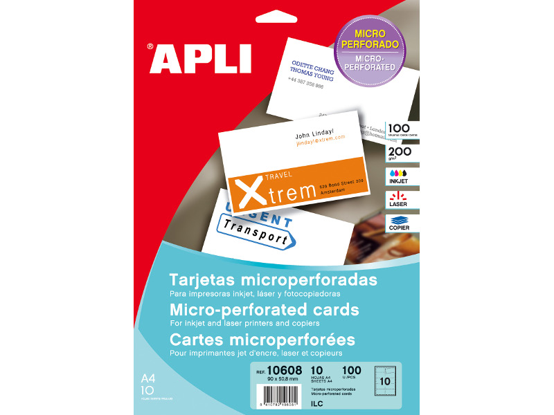 Κατάλληλες για όλους τους τύπους Inkjet και Laser εκτυπωτών καθώς και φωτοαντιγραφικά μηχανήματα. Σας δίνει την δυνατότητα να δημιουργήσετε μόνοι σας εύκολα και γρήγορα την δική σας προσωπική κάρτα. Με μικροπερφορέ για εύκολη κοπή. Διαστάσεις κάρτας 90Χ50.8mm από χαρτί 200gr. Πακέτο 10 φύλλων μεγέθους Α4 ( 100 κάρτες ανά συσκευασία).