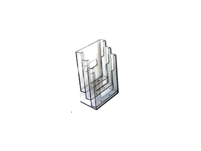 Επιτραπέζιο κλιμακωτό σταντ προβολής για να εκθέσετε διαφημιστικά φυλλάδια, καταλόγους και περιοδικά μεγέθους Α4. Κατασκευασμένο από σκληρό διαφανές πλαστικό. Διαθέτει 3 διαφορετικές θήκες αποθήκευσης. Κατάλληλο για τοποθέτηση φυλλαδίων σε εκθεσιακούς χώρους, ταξιδιωτικά πρακτορεία και αίθουσες συνεδριάσεων.