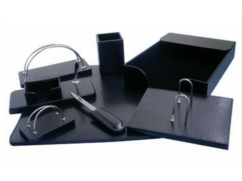 Κομψό σετ γραφείου κατασκευασμένο από γνήσιο δέρμα με μεταλλικές λεπτομέρερεις. Εξαιρετικής ποιότητα. Το σετ αποτελείται από 8 τεμάχια. Διαθέσιμο σε δύο χρώματα: ΜΑΥΡΟ - ΚΑΦΕ.