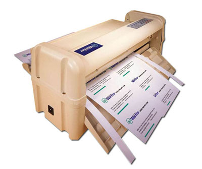 Ηλεκτρική μηχανή κοπής χαρτιών μεγέθους κάρτας επισκεπτηρίου (καρτ βιζίτ). Ιδανική για μικρό όγκο εργασίας με πολύ χαμηλό κόστος. Δυνατότητα κοπής χαρτιού πάχους μέχρι 300γρμ. Κόβει (1) φύλλο την φορά μεγέθους Α4 σε μέγεθος κάρτας 84x54mm. Απλή και εύκολη στην χρήση. Διαστάσεις : 355x110x142mm.
