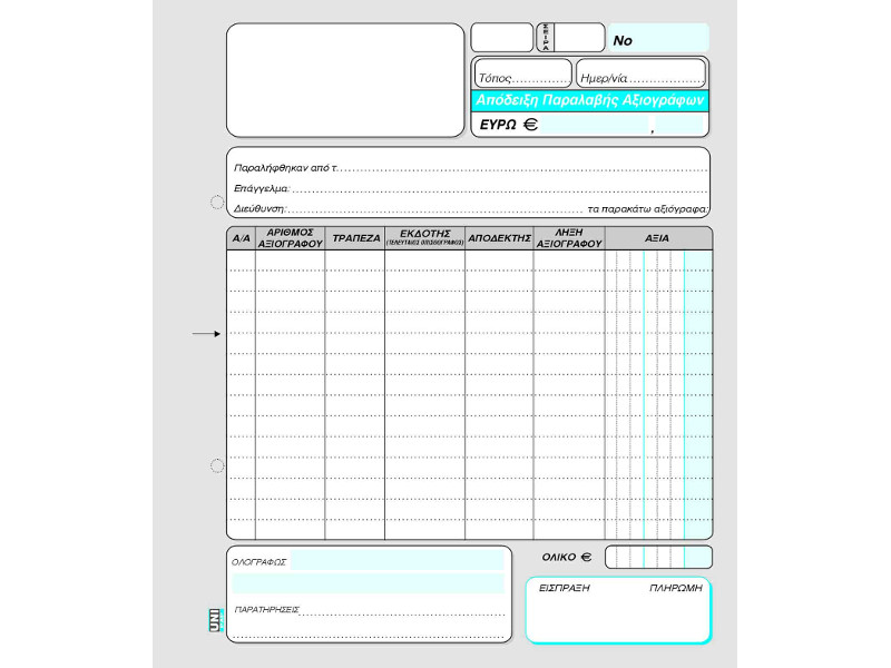 Απόδειξη παραλαβής αξιογράφων. Δεν χρειάζεται καρμπόν. Τριπλότυπο.Διάσταση 19Χ20cm.