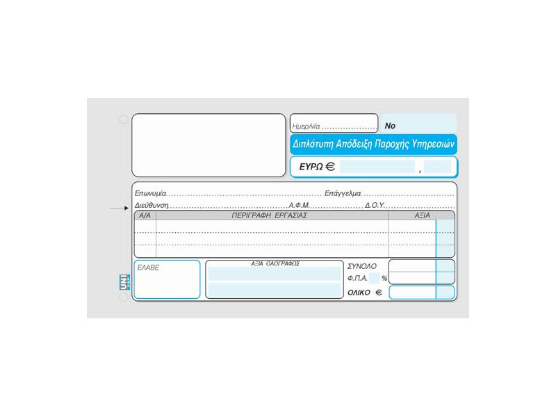 Απόδειξη παροχής υπηρεσιών η οποία συμπεριλαμβάνει ΦΠΑ. Δεν χρειάζεται καρμπόν.Διάσταση 10Χ19cm.