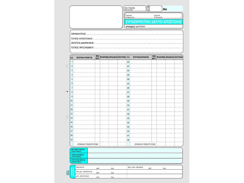 Συγκεντρωτικό δελτίο αποστολής. Δεν χρειάζεται καρμπόν.Διάσταση 21Χ29cm.