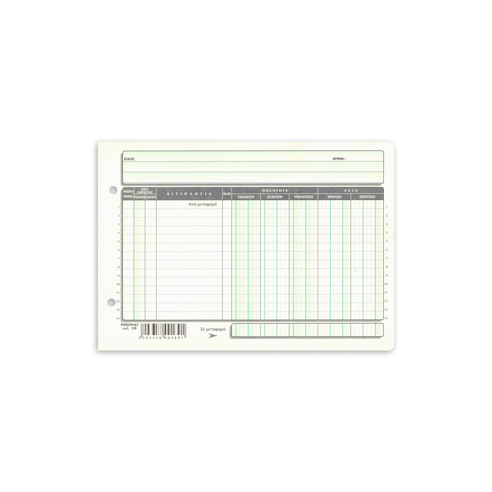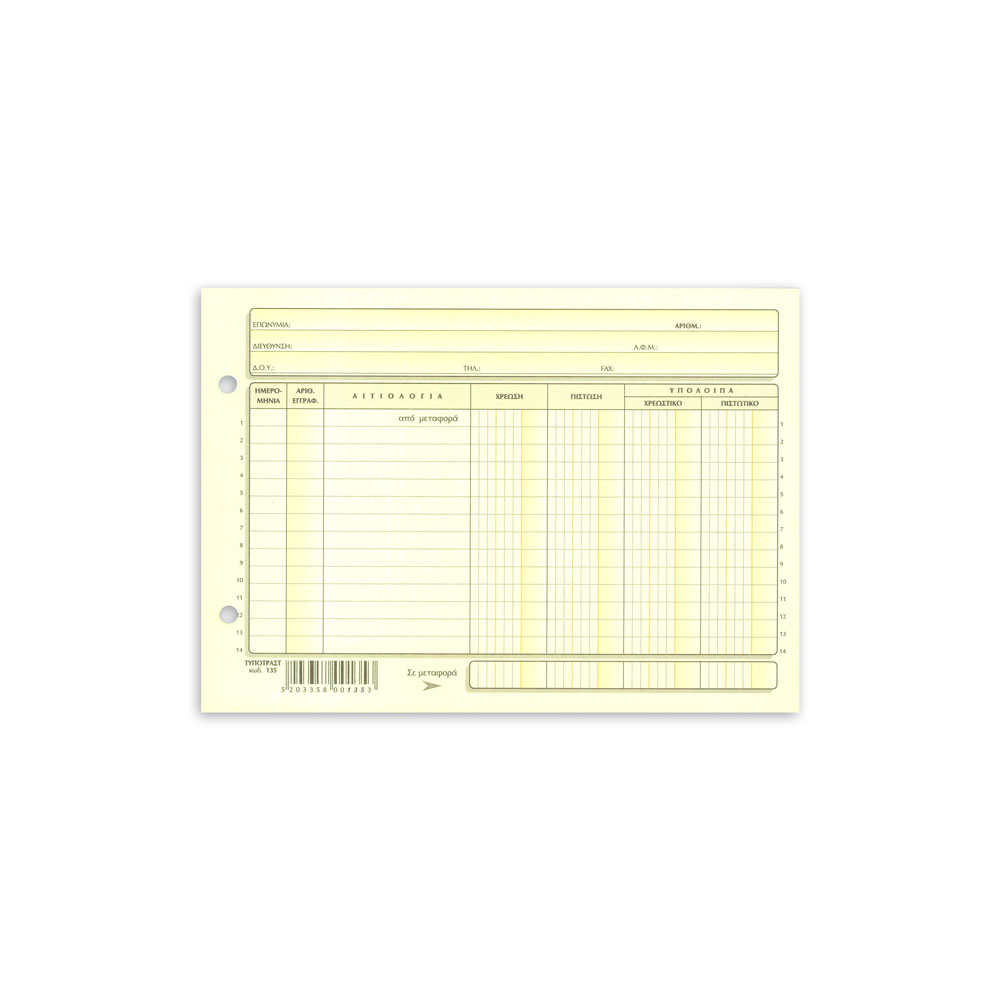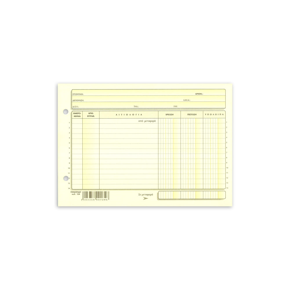 Ανταλλακτικές καρτέλες χρέωσης - πίστωσης πλάγια με οπές αρχειοθέτησης. Διαθέσιμο με 3, 4 & 5 στήλες (αποθήκης). Διάσταση καρτέλας 15x21cm. Πακέτο 100 τεμαχίων. **Υπάρχει ελάχιστη συσκευασία για το προϊόν.