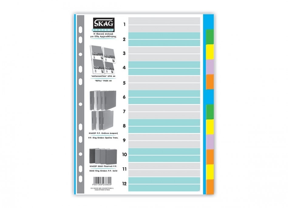 Από χαρτόνι υψηλής αντοχής. Με 12 εγκοπές διαφορετικού χρώματος για την αναγραφή στοιχείων. Με οπές για την αρχειοθέτησή τους σε ντοσιέ και κλασέρ. Ιδανικά για την αρχειοθέτηση και ταξινόμηση των εγγράφων σε 12 θέματα. Γρήγορη και εύκολη αναζήτηση του αρχείου.