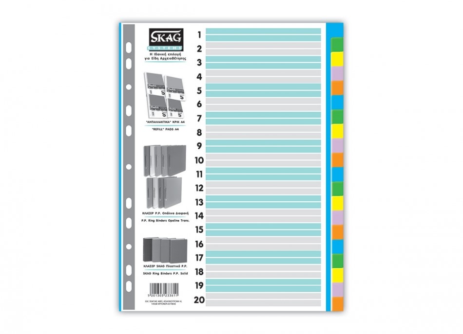 Από χαρτόνι υψηλής αντοχής. Με 20 εγκοπές διαφορετικού χρώματος για την αναγραφή στοιχείων. Με οπές για την αρχειοθέτησή τους σε ντοσιέ και κλασέρ.  Ιδανικά για την αρχειοθέτηση και  ταξινόμηση των εγγράφων σε 20 θέματα. Γρήγορη και εύκολη αναζήτηση του αρχείου.