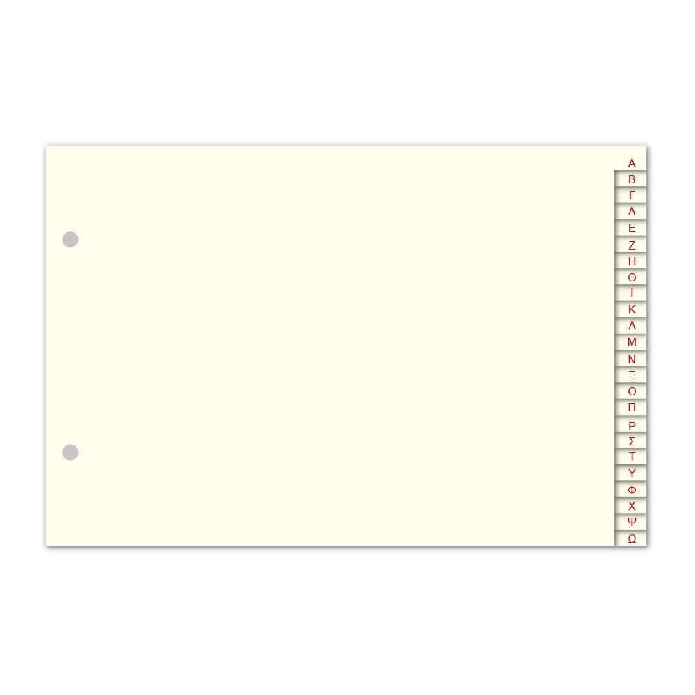 Από χαρτόνι υψηλής αντοχής μεγέθους 20X23cm. Με ελληνικούς αλφαβητικούς δείκτες. Με οπές για την αρχειοθέτησή τους σε ντοσιέ και κλασέρ. Ιδανικό για την αρχειοθέτηση και ταξινόμηση των εγγράφων κατ΄αλφαβητική σειρά. Γρήγορη και εύκολη αναζήτηση του αρχείου.
